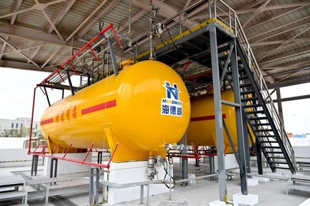 据悉,海德威此次作为项目总包方,以“交钥匙”工程模式承担了氨燃料供给系统的整体设计、核心装备集成及工程化交付工作,构建了覆盖燃料储运、调节控制、安全管理及运行支持的完整系统解决方案,提供涵盖氨燃料储罐、氨燃料供给模块、卸车压缩机、氨燃料输送泵、氨气相处理系统、可燃气体探测及双壁管在内的整套全流程定制化解决方案。作为面向实船应用的重要平台型项目,该测试平台严格按照船用产品标准设计建造并满足陆地验收要求,海德威在其中的角色不是单一配套商,而是围绕平台运行目标进行系统拆解、接口统筹、模块集成和工程交付的组织者。